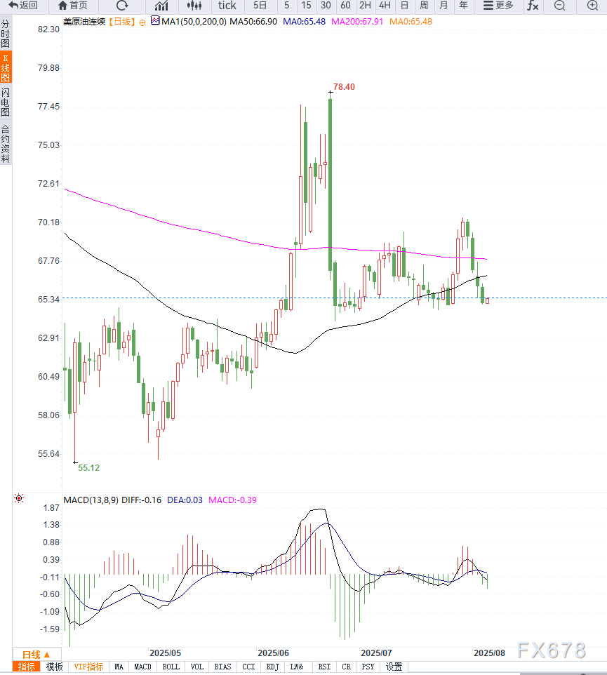 OPEC+(石油输出国组织及其盟友)周日宣布,将于9月将产量提高54.7万桶/日。这一决定提前结束了该组织此前实施的减产协议。   OPEC+目前供应全球近一半原油,其加速恢复产量的举措,旨在抢占市场份额。   不过,此举也加剧了市场对供应过剩的担忧,尤其是在需求复苏尚未稳定的背景下,进一步增加了油市的不确定性。   亚洲国家面临来自美国的巨大外交与经济压力。尽管美方希望借此方式推动俄罗斯作出和平决策,但亚洲国家政府已明确表态,称关税威胁“缺乏依据”,并誓言捍卫其经济利益。   这种局势使得国际贸易关系再度紧张,部分市场人士担忧这可能导致原油供应链出现扰动。   除了地缘风险因素,美国方面的库存数据也为油价提供了支撑。“美国最新的原油库存数据显示供应趋紧,对市场形成实质性支撑,”Yuki Takashima补充道。   根据市场调查,美国石油协会(API)数据显示,上周美国原油库存减少了420万桶,远超此前预期的60万桶降幅。美国能源信息署(EIA)将在周三晚间公布官方库存数据,若进一步确认大幅去库,将可能强化市场对供需紧张的预期。   从美原油(WTI)日线图来看,价格在触及60美元上方的关键支撑区域后出现明显反弹,形成看涨吞没形态,显示短期多头重新占据主动。   目前价格已重新站上5日均线,并尝试向20日均线靠拢,若能有效突破65.80美元的短期阻力位,将有望挑战67.50美元附近的中期阻力区。   相对强弱指数(RSI)回升至中性区间上方,动能指标MACD虽仍处于负值区间,但出现缩口迹象,暗示下行动能正在减弱。整体来看,若无新的供应利空消息,WTI短期走势倾向震荡反弹格局,但上方均线压力依然明显,需关注能否放量突破。