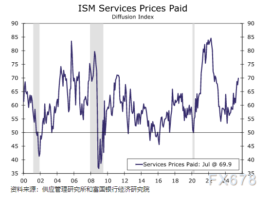 周二(8月5日),美国供应管理协会公布了美国7月ISM非制造业PMI,结果从6月的50.8降至50.1,低于预期的51.5,逼近荣枯线临界点,创2020年疫情以来第三低读数。价格支付指数飙升至2022年末以来最高的69.9,就业指数跌至疫情以来第三低的46.4。PMI作为各国经济活力的先行指标,能显著影响各国资产价格的估值中枢。美国7月ISM非制造业PMI意外萎缩,关税政策成服务业放缓主因。
