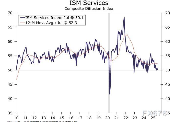 美国7月ISM服务业PMI出炉降至 50.1,逼近荣枯线,关税或成主因,推高通胀、拉低就业,经济隐忧加剧。