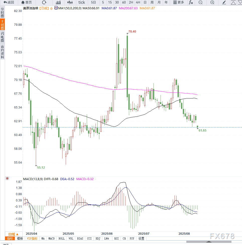 特朗普计划在周一与乌克兰总统泽连斯基及欧洲领导人会面,试图推动快速和平方案以结束这场被称为“欧洲八十年来最严重的冲突”。   市场原先担忧,美国可能对仍在采购俄罗斯石油的主要进口国实施二级制裁,导致供应链受阻。然而特朗普在会后表示,短期内不会对亚洲国家采取惩罚性关税措施,但未来“两三周内可能重新评估”。这一表态使得市场担忧情绪暂时降温。   据市场调查显示,俄罗斯原油的最大买家为亚洲国家,其次为印度。这意味着美国任何进一步的制裁都可能引发全球能源市场更大波动。   “真正被市场消化的,是美国可能针对主要买家的二级制裁。而特朗普已明确表示,至少对亚洲国家不会立即采取额外措施。”——RBC Capital分析师Helima Croft   与此同时,投资者也在等待美联储主席鲍威尔本周于杰克逊霍尔的讲话,以判断货币政策的未来方向。市场预期,美联储或将在9月17日的FOMC会议前继续保持观望。   “鲍威尔很可能维持审慎立场,依赖即将公布的就业和通胀数据,再决定是否降息。”——IG市场分析师Tony Sycamore   从日线图来看,美原油价格在61美元附近获得初步支撑,但上方65美元一线依旧构成显著压力位。若油价持续运行在20日均线下方,短期走势可能维持震荡偏弱格局。   MACD动能柱仍处于收缩阶段,显示空头力量有所减弱,但多头尚未形成有效突破。若后续消息面不利于供应收紧,油价可能在60-65美元区间震荡整理,突破方向仍需依赖地缘局势和美联储政策信号。